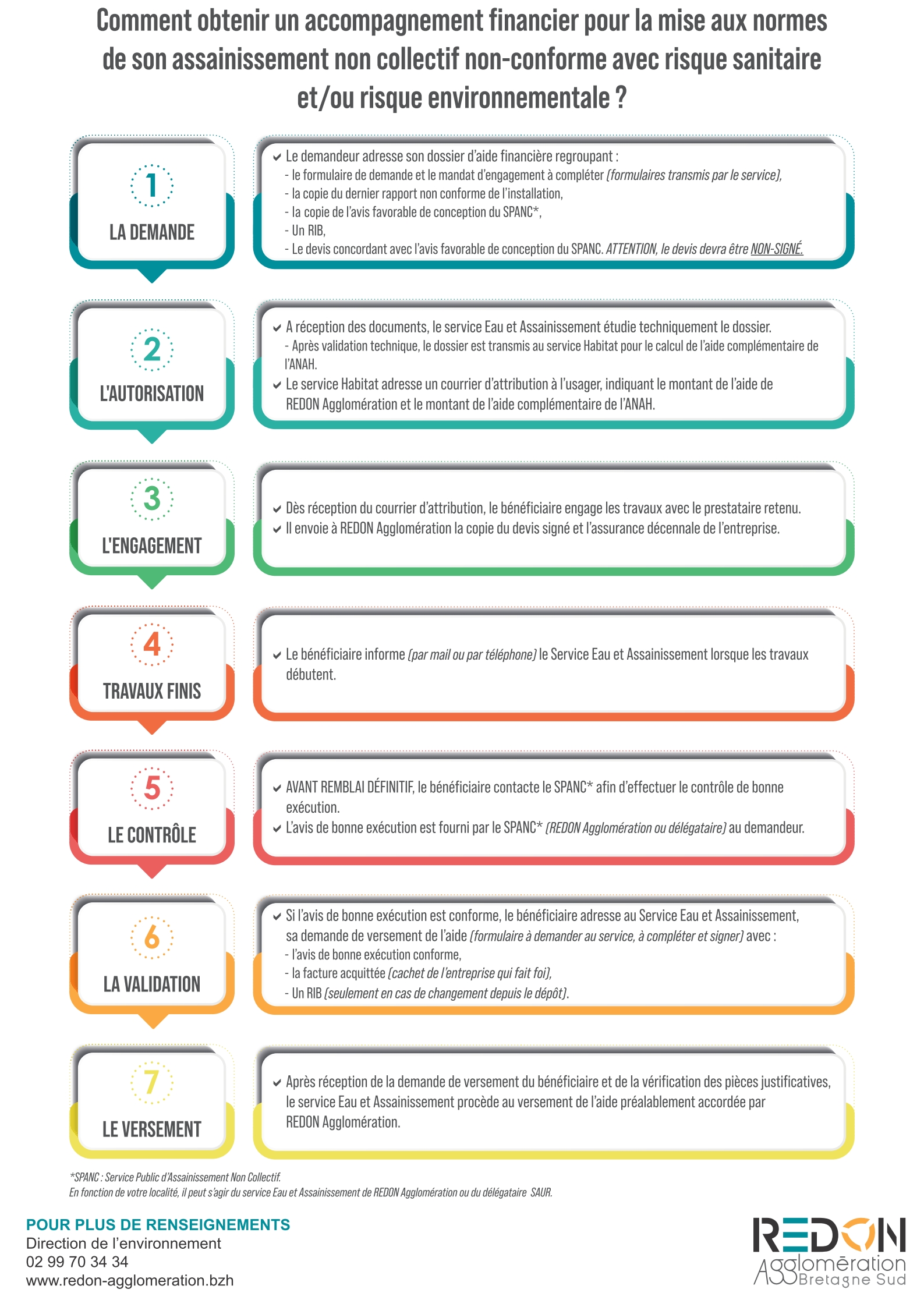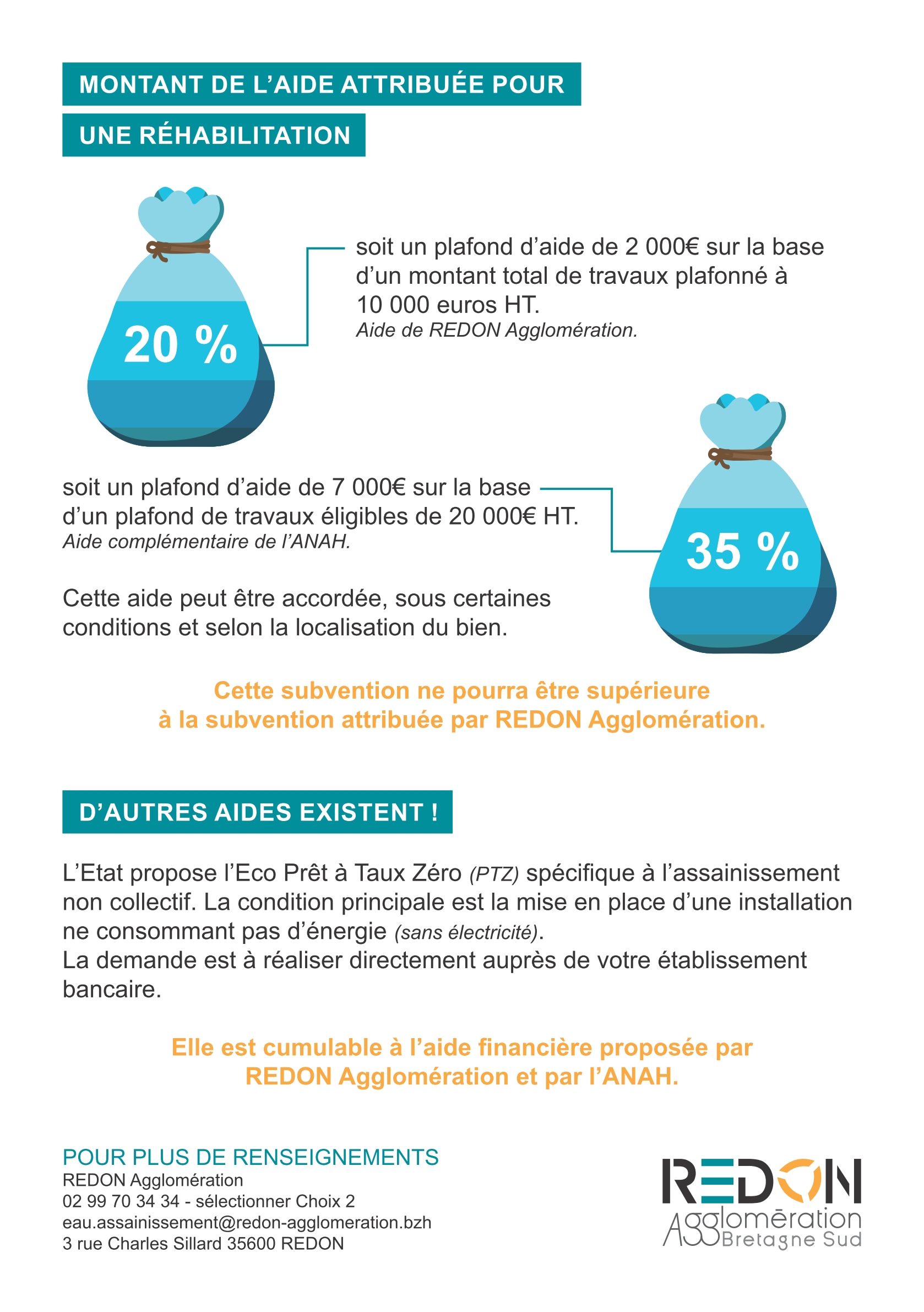 Avis aux propriétaires occupants (résidence principale) dont l'installation d’assainissement individuel a été contrôlée "non conforme" ; des travaux de remise aux normes sont nécessaires, dans la mesure où l'installation présente un risque sanitaire et environnemental. REDON Agglomération a mis en place un programme d’aide financière qui permet aux habitants du territoire disposant de "revenus très modestes" de bénéficier d’une aide financière s’élevant à 20 % du montant des travaux. Retrouvez dans cette page les conditions, modalités de la demande et coordonnées de contact.