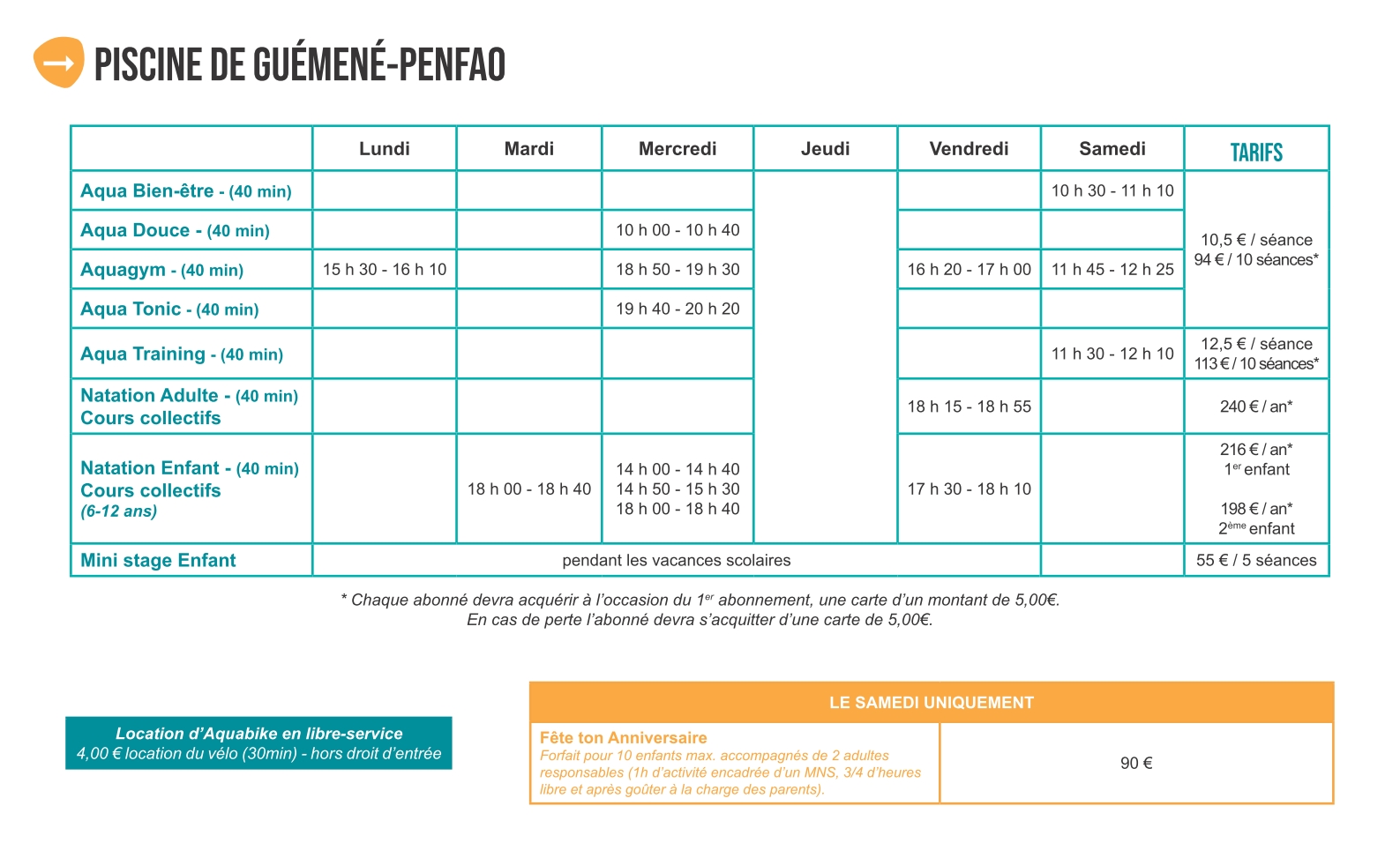 Tout au long de l'année, l'équipe de la piscine propose plusieurs séances et cours : aquagym, aquatraining, aquabike, cours collectifs, jardin aquatique... Des mini-stages enfant sont proposés à chaque période de vacances scolaires. Profitez également des animations aquakids (bébés nageurs) et Fête ton anniversaire !