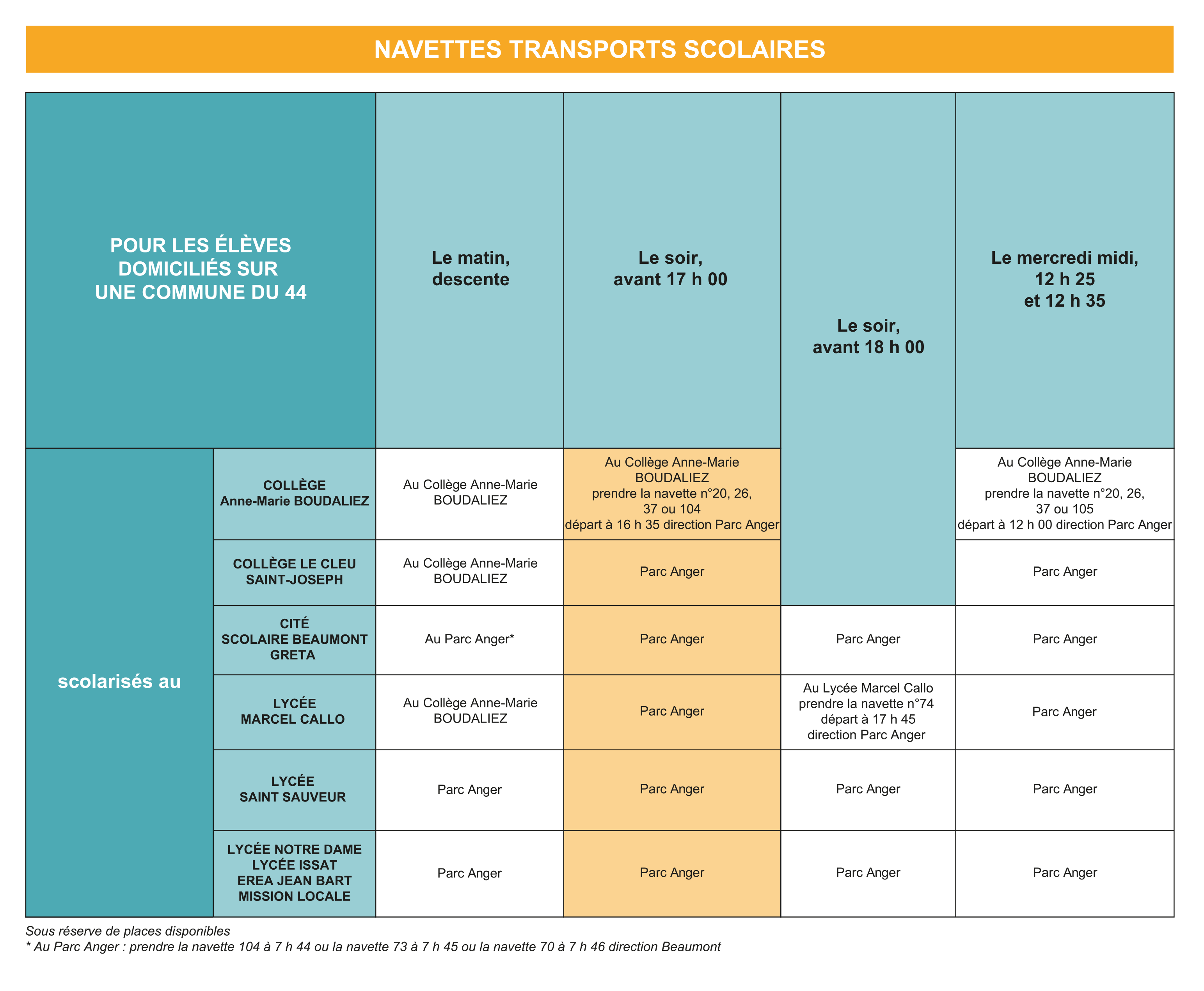 Sur la carte de transport ou sur la fiche parcours, le retour du mercredi correspond toujours au midi. Cependant, si un lycéen a cours le mercredi après-midi, il peut emprunter les services de 17 h au départ du parc Anger.